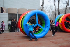 教职工分为两队,每队三人一组进行接力赛。然后紧张的比赛开始了,老师们一改往日的严谨,沉浸在比赛的欢呼喝彩声中,尽情享受着活动带来的乐趣与快乐。在“动感五环、旋转向前”比赛中,有的老师被五环绊倒,没等站稳又继续跑,接着又被绊倒,又匆忙起身跑,一路跌跌撞撞奔向终点;还有的老师由于跑动过快,偏离了方向,但仍毫无顾虑地跑着,逗得观众前仰后合。比赛结束后,肉视频